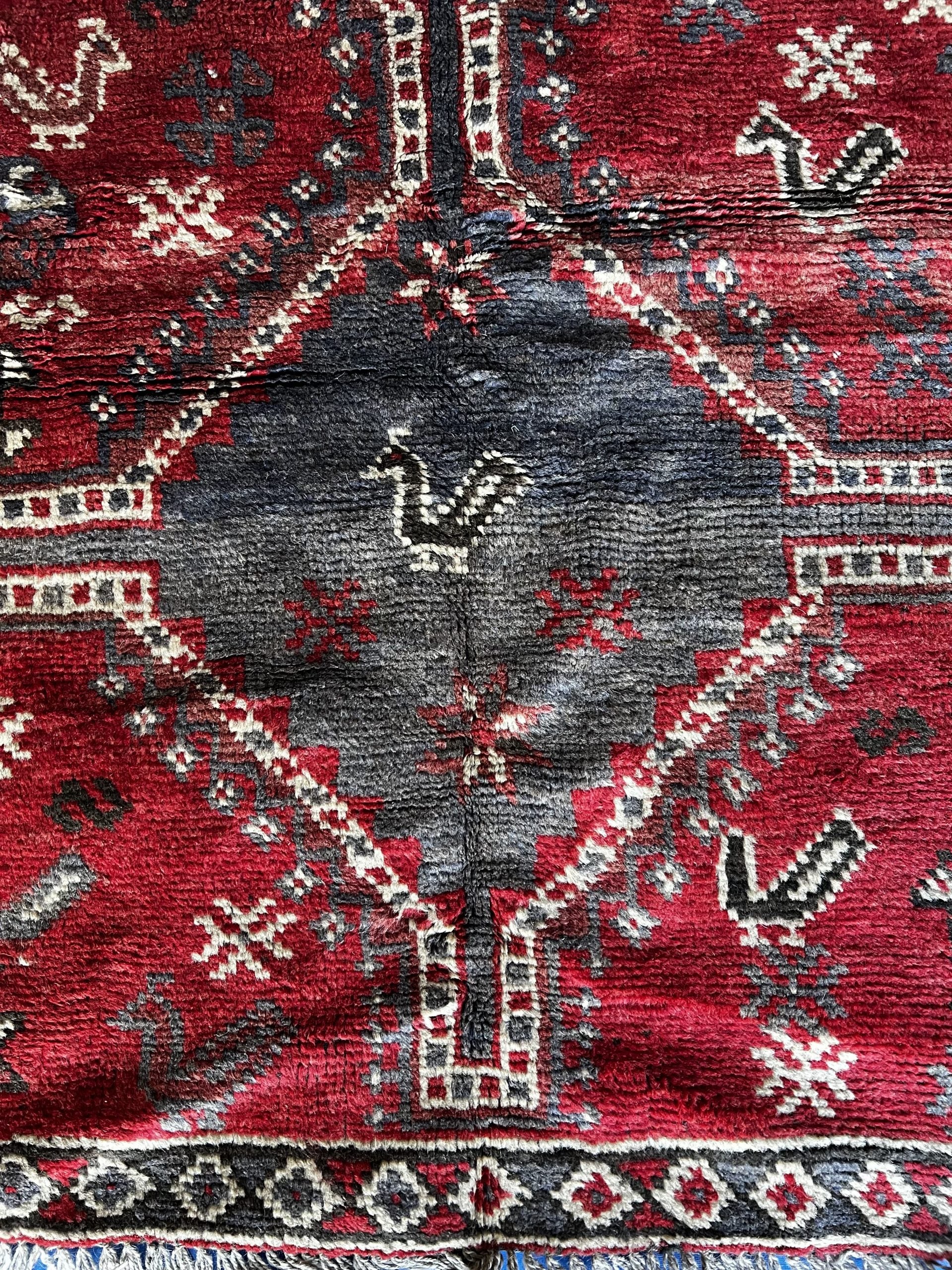 True to Qashqai tradition, the design was woven from memory, making each rug a one-of-a-kind narrative of the weaver’s life. Balto showcases whimsical diamond motifs in cobalt blue set against a rich red ground, punctuated with birds, stars, snowflakes, and geometric symbols.