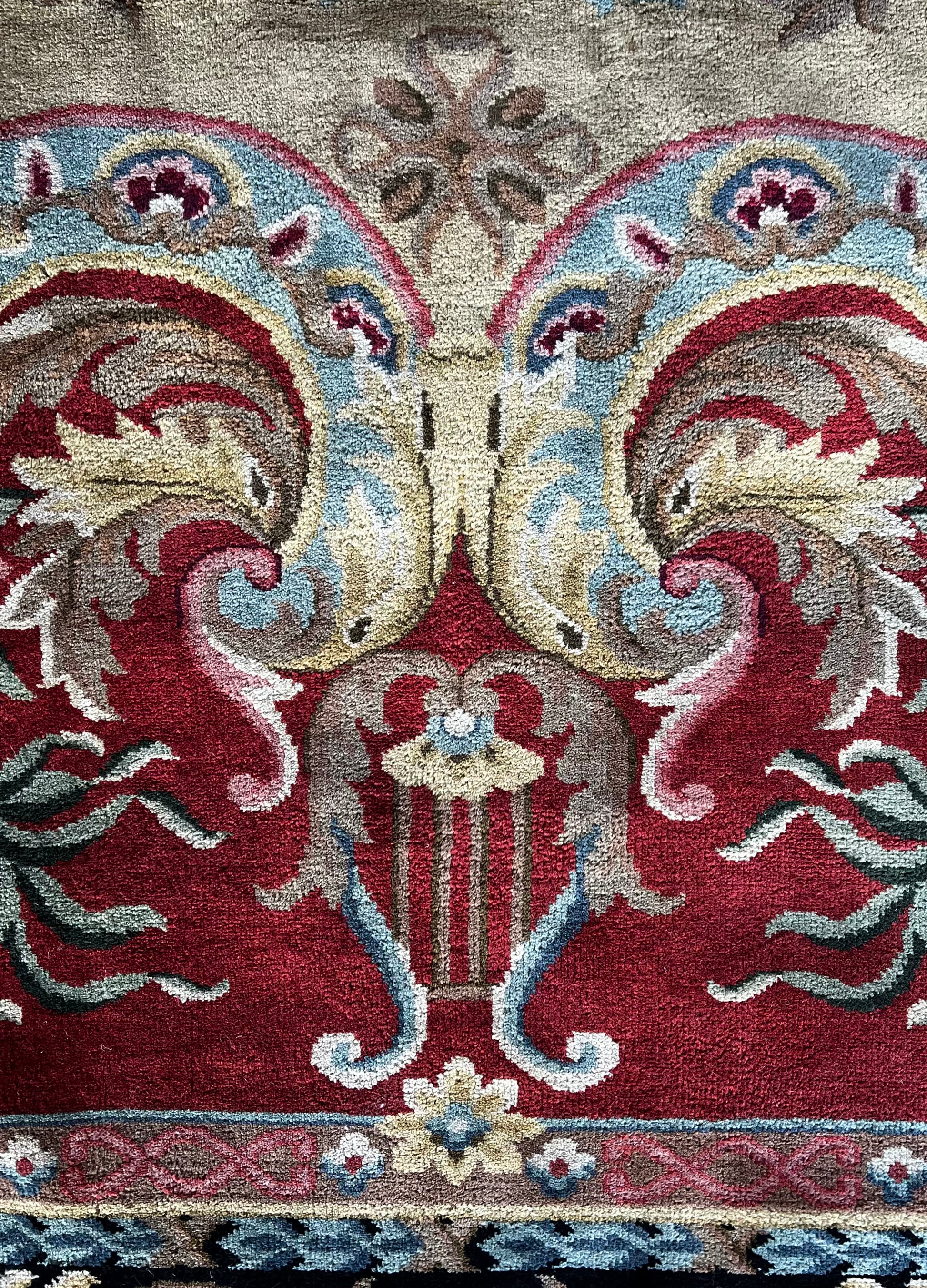 Margot is a magnificent hand-knotted Aubusson-style rug that seems destined for greatness. She is in excellent condition and crafted from premium wool for a plush, soft feel underfoot. Hand-knotted in India, Margot features a deep shade of coral red with a large center medallion and a black ground border dotted with pale blue, pale pink and very pale shades of a buttery gold.
