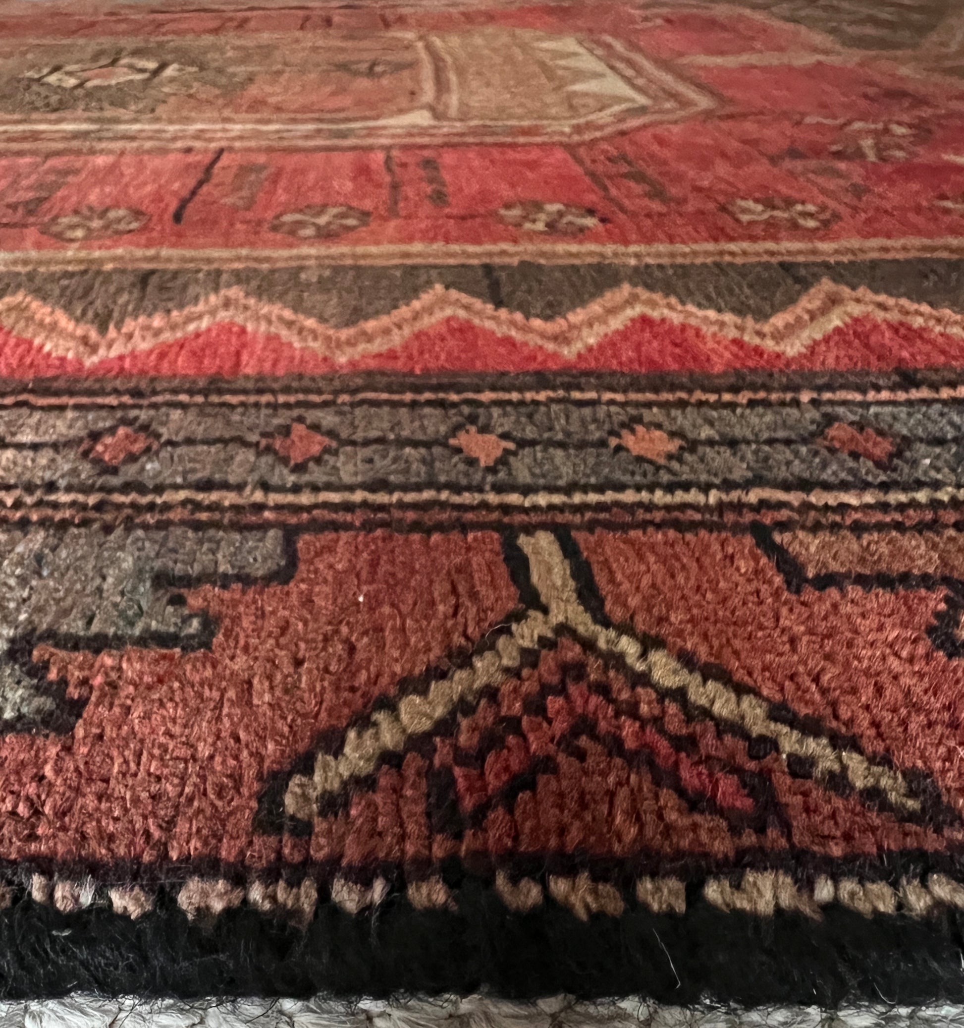 The natural vegetable dyes have mellowed into muted shades of deep ruby, rust, and brown, set against a black ground with subtle teal accents. Hand-knotted with care, Cleo features beautiful geometric motifs throughout. With a soft medium-low pile and velvety sheen, it's both comfortable yet druable enough for hallways, living rooms, or entryways.