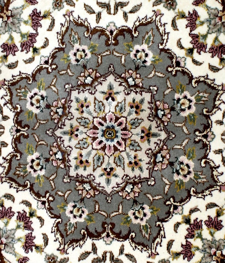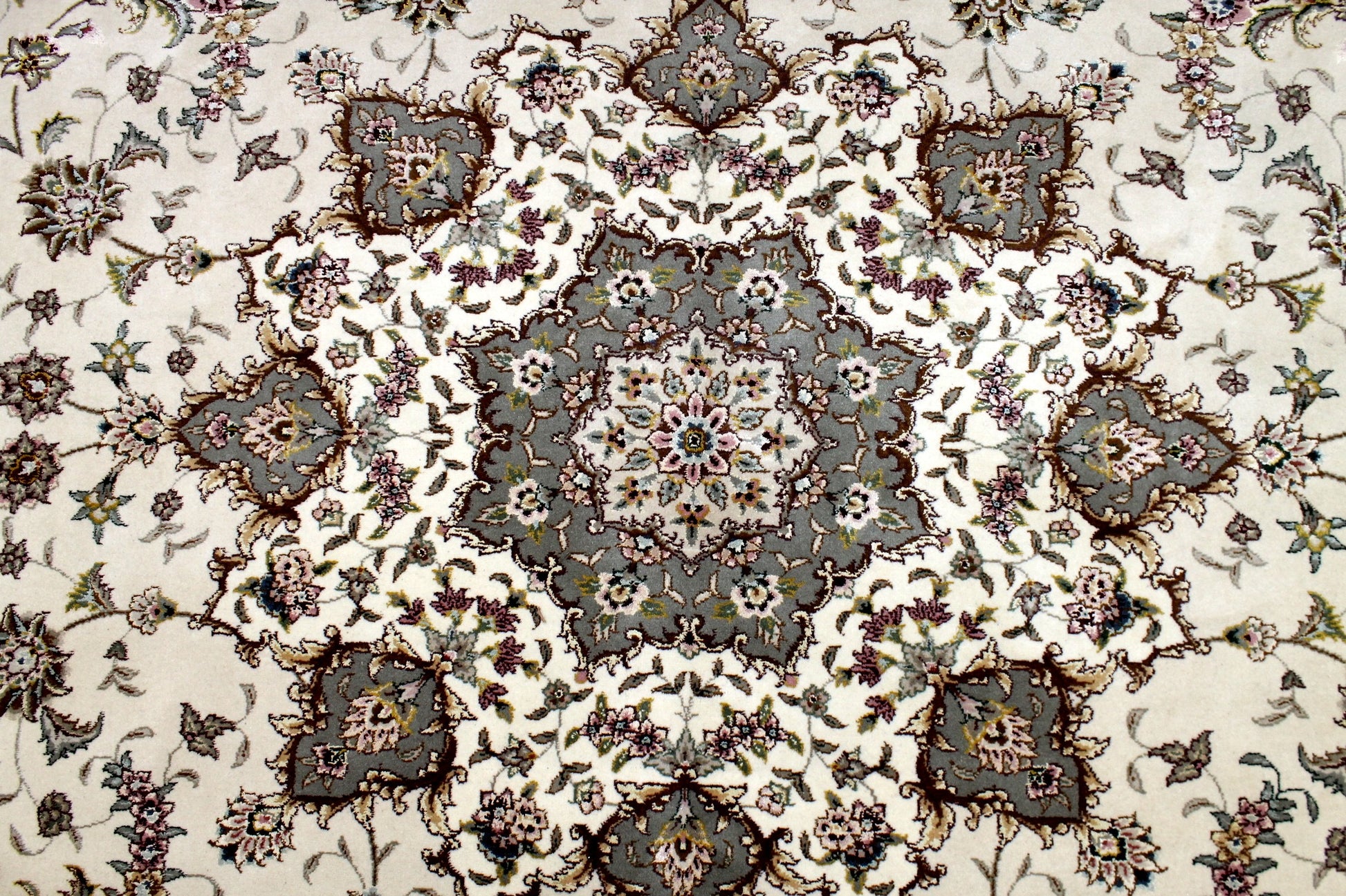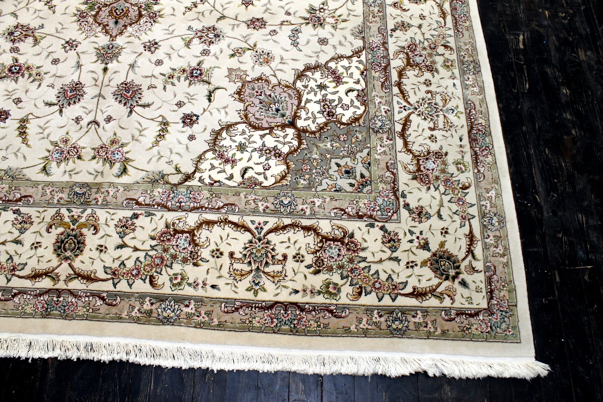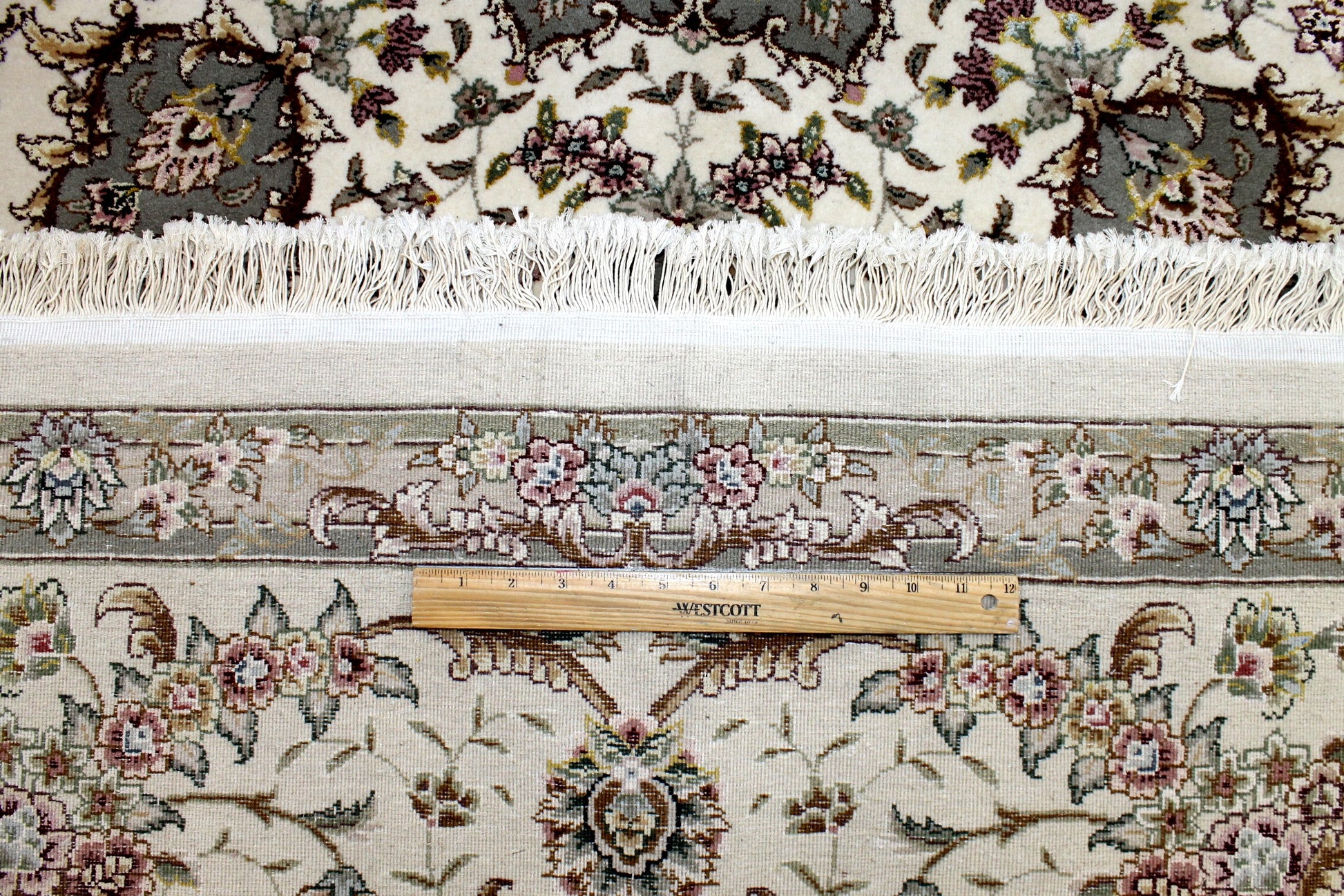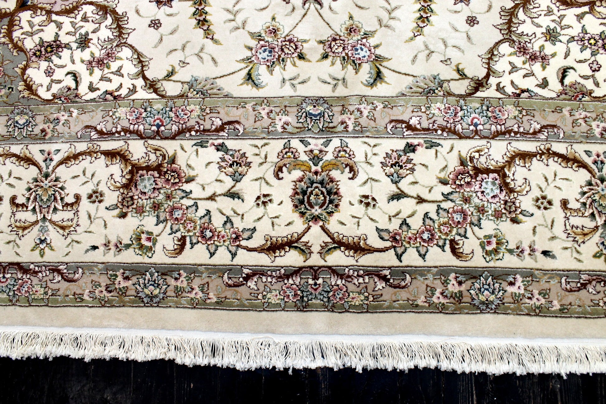 Elena is a beautiful hand-knotted new Persian Tabriz rug crafted in China with a luxurious silk and wool pile. Since China stopped producing hand-knotted rugs in 2019, authentic hand-knotted rugs like Elena are increasingly rare and highly sought after. This Persian-style Tabriz features a thick, soft wool pile and an allover floral design in elegant neutral shades of grey, pale blue, blush, and soft green in silk accents on an ivory ground. Perfectly balancing formality and livability, Elena brings classic sophistication to a room, making her a rare, heirloom-quality rug for modern interiors. True sophistication doesn’t need to try too hard.