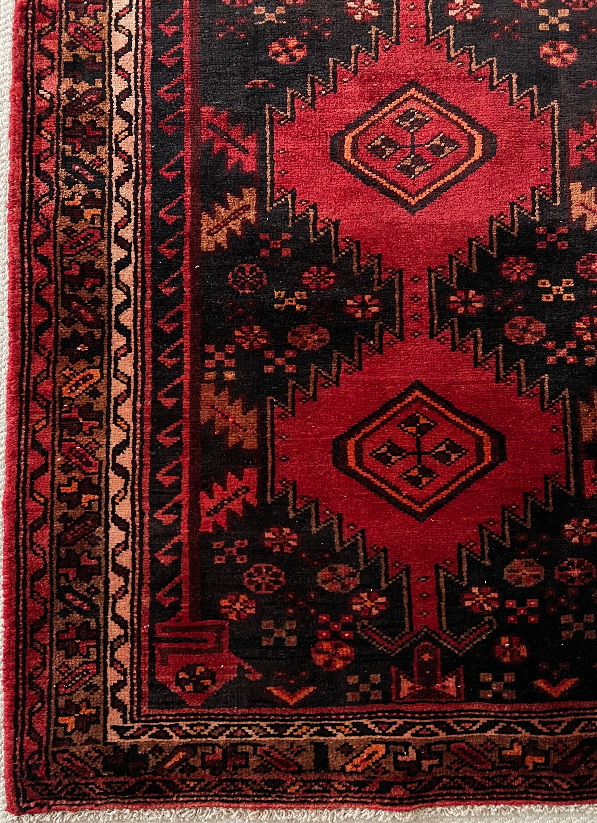 Solis is a vintage tribal Heriz runner that carries the strength and presence of your grandfather's well-loved tweed jacket. Hand-knotted in wool on a sturdy cotton foundation, it’s anchored by a deep black field with bold red, warm sienna, and gold accents.
