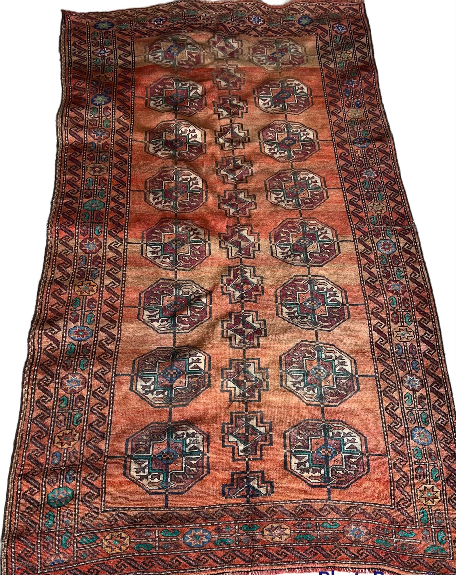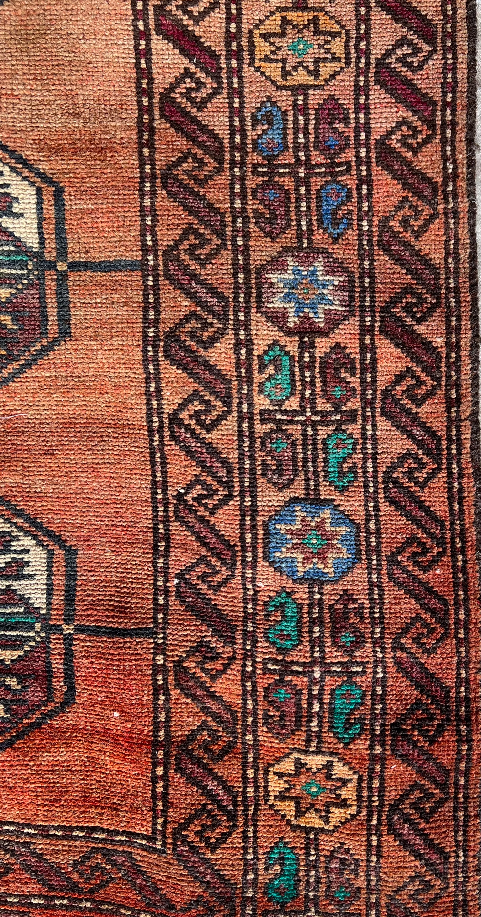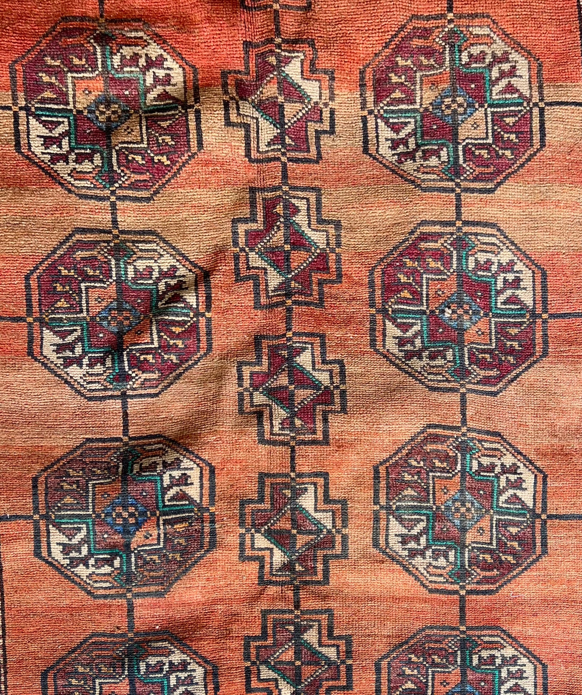 Talitha is an antique Persian Turkoman hand-knotted rug. There is a glorious persimmon ground with teal and ivory accents, which is framed by a beautifully detailed black and brown border scroll. Crafted from fine wool with meticulous knotting, it’s soft underfoot with a low pile showcasing intricate tribal motifs throughout.