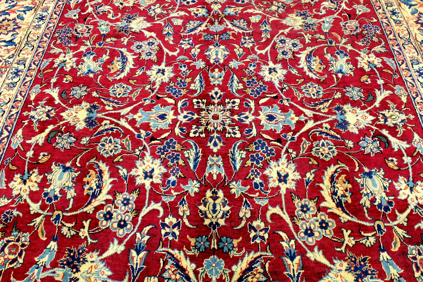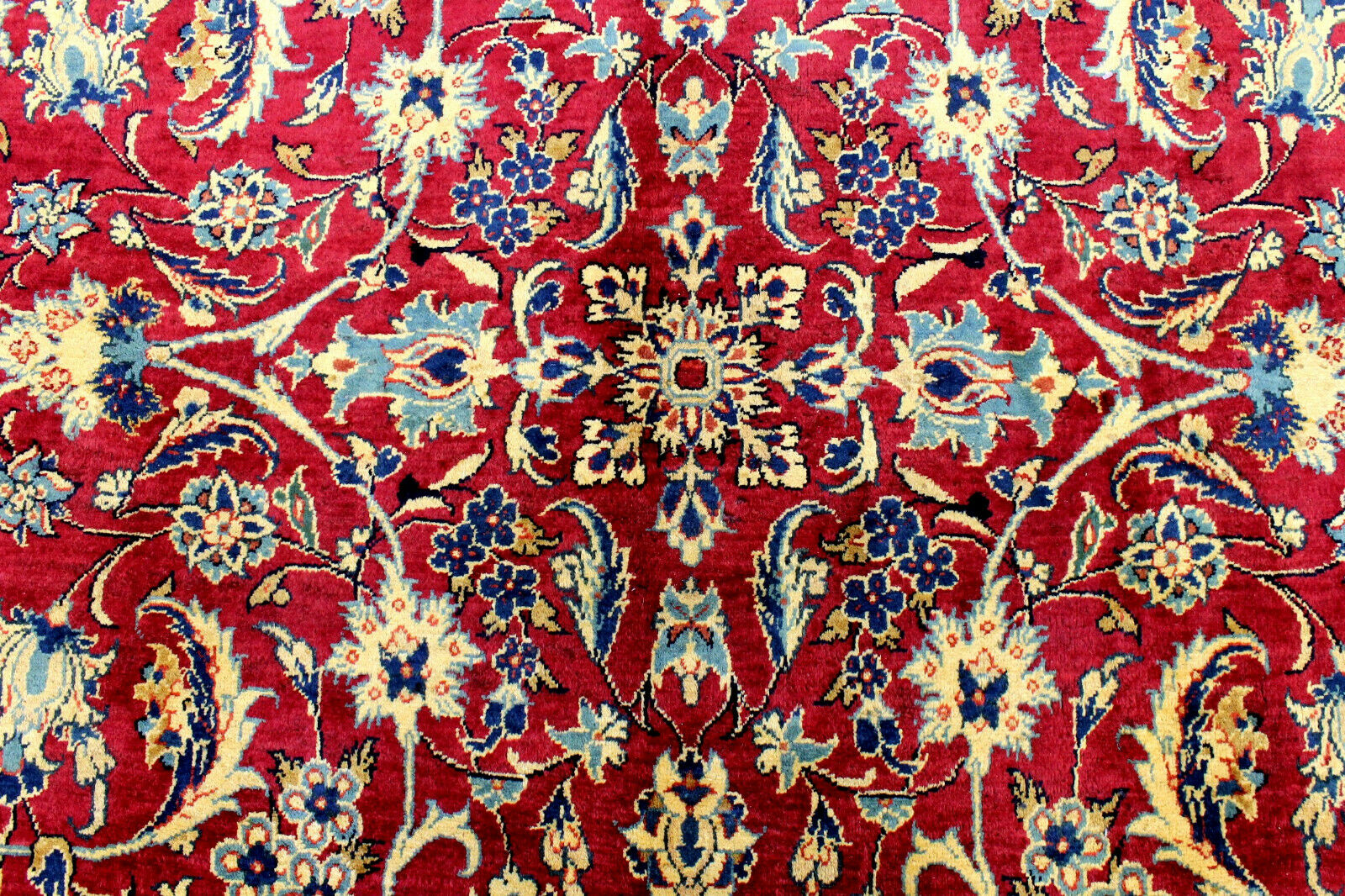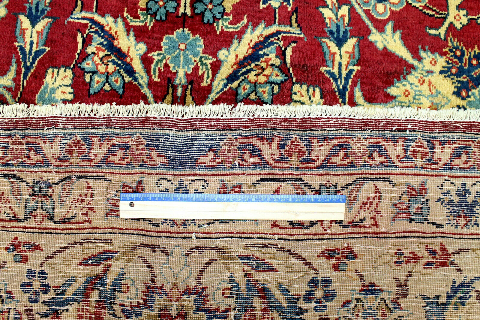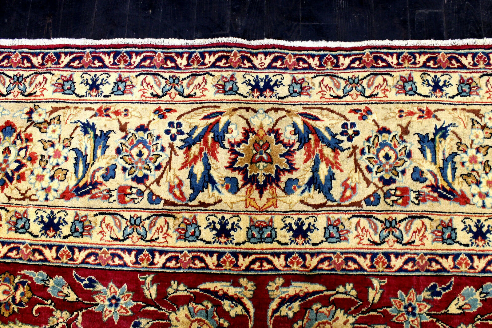 The details feature an elegant allover floral and vine design on a deep maroon field, framed by a light golden border. Woven with more than fifteen distinct colors, the intricate motifs are layered with remarkable detail and dimension, creating a composition that feels both classic and dynamic.
